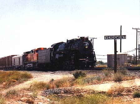The 4-8-4 roars through Fullerton on the middle track at about 50 mph.