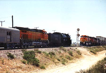 Just downhill from Cajon, a westbound intermodal train blocked most of the view of the steam engine.
