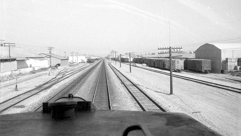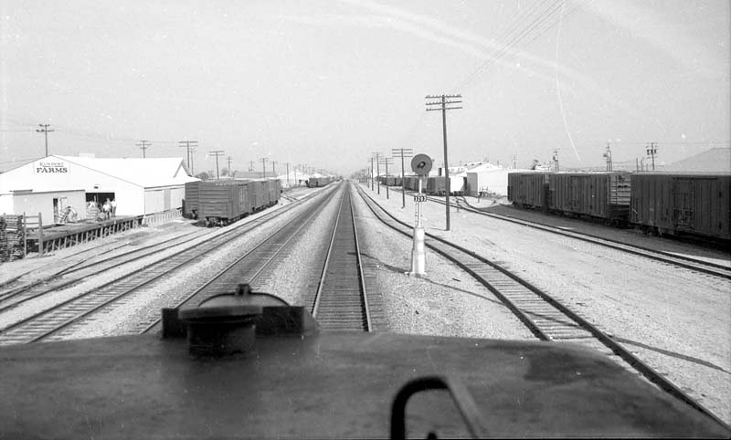 Photo 79-2. This photo shows the middle of Edison from the cab of the westbound SP Starpacer as it approaches the block signal seen in the distance in Photo 79-1. To the right behind the mechanical reefers on is Big L Packers (tracks 74 and 75). At the left is Kundert Farms (tracks 46 and 47). There more views of Big L Packers in Photo 91-1 and of Kundert Farms in Photos 08-7 and 08-8, below. (John Signor collection) 1991