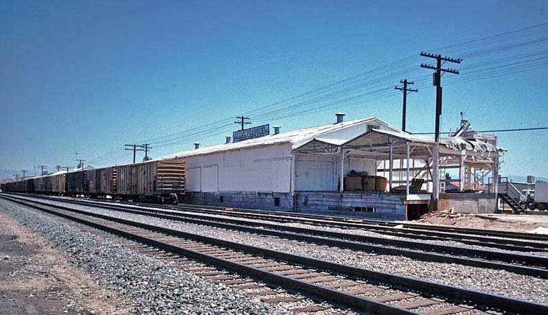 August 2009 Update from Robert Gaddie: "J. R. Simplot manufactures fertilizer and sells agricultural chemicals to farmers in the southern San Joaquin Valley. A daily local serves Edison from Bakersfield. The normal locomotive is a remote controlled unit. Union Pacific 735 (GP 38-2) was providing the service. When the train is operated using remote control Railroad Police caboose 4709 is added to the train. The engineer stands on the rear platform of the caboose when the train is being operated in push mode." 2003