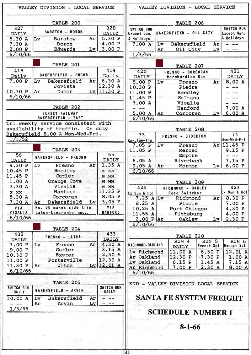 Note that Train #56 operated from Fresno to Bakersfield over the Visalia District but returned to Fresno as Train #55 over the main line via Hanford. It also made a side trip to Orange Cove on the Porterville-Orosi district. Train #420 ran a similar route but turned at Corcoran rather than Bakersfield and became Train #421. Trains 420/421 were known as the "merchandise switch." Trains 432/433 operating over both the Visalia and Porterville-Orosi districts were known as the "Ultra Turn." A Santa Fe Freight Operation in 1967