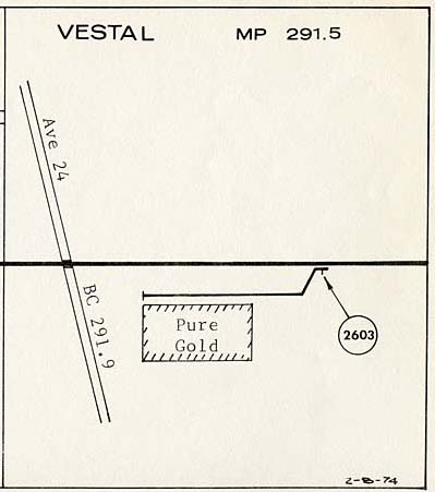 Historic Packing Houses, Packing Sheds and Other Industrial Structures Eastside Lines: Southern Pacific, Santa Fe and Visalia Electric Copyright 2008 by James E. Lancaster, Ph.D. Web Page Created December 2, 2008 Joint SP-ATSF Exeter Branch ![]() Vestal, CA All photos are copyrighted. They remain the property of the individual contributors and may not be used without permission. ![]() February 1974 SPINS Diagram. (James Lancaster collection) ![]() M. Hure & Son in September 2008 is the former Pure Gold facility on the SPINS Diagram. Note that the spur track is still in place, unusual for 2008. (James Lancaster collection) ![]() Track side view of the former Pure Gold facility in September 2008. (James Lancaster photo) If you have any comments or questions please feel free to contact me at ljames1at (i.e., @) ix.netcom.com (no spaces). |