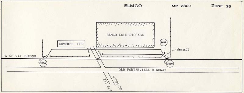 Historic Packing Houses, Packing Sheds and Other Industrial Structures Eastside Lines: Southern Pacific, Santa Fe and Visalia Electric Copyright 2008 by James E. Lancaster, Ph.D. Web Page Created December 2, 2008 Exeter Branch Elmco, CA All photos are copyrighted. They remain the property of the individual contributors and may not be used without permission. ![]() February 1974 SPINS Diagram. (James Lancaster collection) ![]() Elmco Cold Storage, August 2006. Note the eight loading doors as shown on the SPINS diagram. (James Lancaster photo)