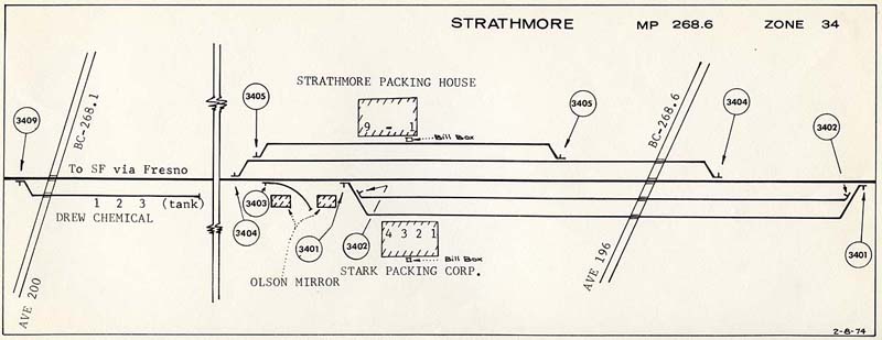Page Created January 8, 2009 SP Exeter BranchStrathmore, CA All photos are copyrighted. They remain the property of the individual contributors and may not be used without permission. ![]() February 1974 SPINS Diagram. (James Lancaster collection) ![]() Stark Packing Corp. packing house, July 2006. (James Lancaster photo) ![]() Stark Packing Corp. sign, November 1992. (Cliff Prather photo) ![]() Stark Packing Corp. packing house, August 2006. (James Lancaster photo) ![]() Additional buildings of the Stark Packing Corp., August 2006. (James Lancaster photo) ![]() A San Joaquin Valley RR freight train approaches the Strathmore Packing House (right) in November 1992. (Cliff Prather photo) ![]() Strathmore Packing House, July 2006. This newer packing house was located about a half mile west of the SJVRR tracks. (James Lancaster photo) ![]() By