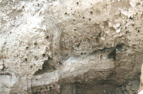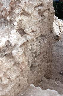 | 9. This close-up photo shows partially collapsed layers of mud bricks on the north and west side of the gate. |
