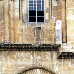 Amos Elon, in his book "Jerusalem, Battlegrounds of Memory3," wrote that the ladder belongs to the Greeks and cannot be moved because of the Status Quo. The book "Jerusalem In 3000 Years7," has a small photo of the ladder and also attributes its longevity to the Status Quo. With so little published on the ladder, I tried some other avenues to get more information. From a contact at the Christian Information Center in Jerusalem came the following: "The short ladder is part of the facade of the Holy Sepulchre Church because of the 'Status Quo.' It seems strange -- it has to be renewed, even when rotten, through a similar one (in wood) as a ladder has been there [since] the 19th century." An Israeli tour guide I know offered a similar explanation: "There are so many legends and stories of unknown origin that I have been unable to find any substantive evidence of any religious significance for it being there. The ladder has to be there as it is part of the Status Quo of the Armenian Church."