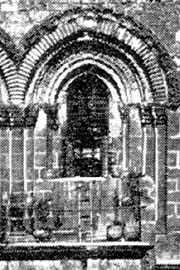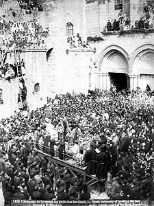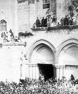 The quote above from Cust in Fr. O'Connor's letter points out how the Armenians use the balcony where the ladder rests 'on the occasion of the festival ceremonies that take place in the Courtyard.' One such ceremony is the washing of the feet that occurs each year in conjunction with Easter. The undated photo below (left) and the enlarged view of the entrance (right) show the crowd filling the courtyard and occuping every cornice and balcony, including the one with the ladder, during the foot washing ceremony.