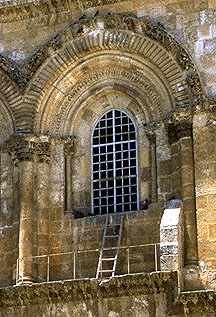 There seems to be a consensus on a couple of facts: (1) the ladder is there because of the Status Quo, and (2) the window belongs to the Armenians. However, there seemed to be some disagreement about who controls the balcony - Greeks or Armenians - and why the ladder is there, i.e., to clean the windows or give the Armenians access to the balcony? Or is there another, yet-to-be-discovered, totally different explanation? The next time you're in Jerusalem and visit the Church of the Holy Sepulchre look for the ladder. If it's still there you'll know the Status Quo is still in effect. Postcripts September 1998. In a 1998 book on churches in Jerusalem,5 Aviva Bar-Am told about the ladder in her section on the Church of the Holy Sepulchre. When describing the entrance to the church, she wrote, "Note the ladder under one of the second story windows. It was used over a century ago for hauling up food to Armenian monks locked in the church by the Turks. With the statu[s] quo still in force, the ladder seems destined to remain there forever!" April 1999. A photo of the Church of the Holy Sepulchre by R. Malcom Brown6 of the University of Texas showed the ladder and a change in the window above the ladder. A grate had been added to the window to keep people from reaching the ladder when the window is open. A prior incident where the ladder had been removed as a prank caused the installation of the grate.