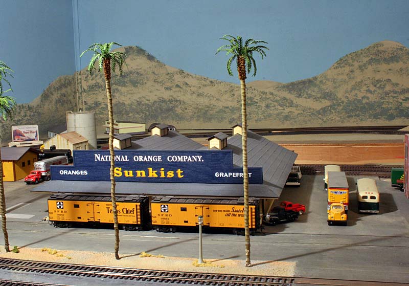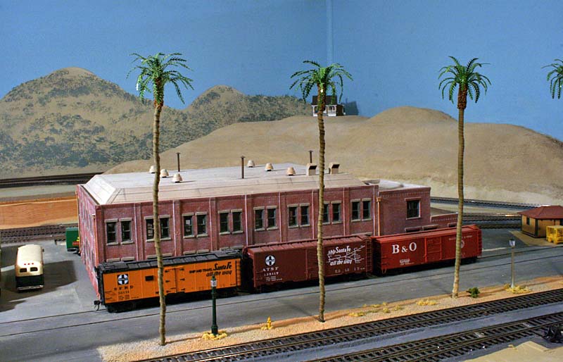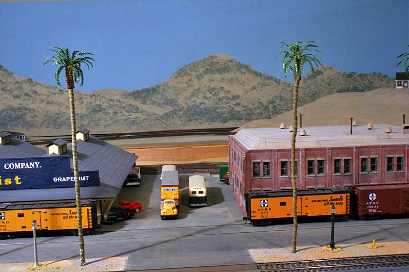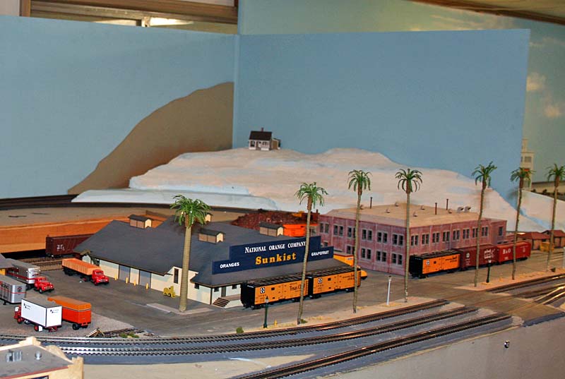 ![]() The next photo shows the hill and packdrop after some scenery work. When I got the hill to its final shape it was painted with tan flat latex paint from Orchard Hardware Supply (OSH). The painted surface was then covered with Polyblend colored grout. Some of it was sifted on dry then sprayed with water. Some of it was sifted onto still tacky paint. The grout is a mixture of two colors, "Linen" and "Bone." I plan on adding some orange trees around the house and on the flatter parts of the hill and some chaparral on the rest of the hill. For the chaparral, I'm going to try coating some clumps of lichen with some AMSI gray-green ground foam. ![]() The backdrop, shown