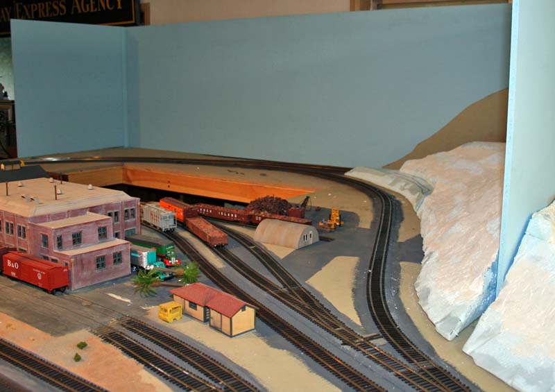 The first photo (below) is an overview of the right side of the Riverside area and was taken in mid-February. I first removed a long curving backdrop from this area. There was a lot of unusable space behind part of it and the other part blocked the view of the back of the Corona engine terminal. I replaced it by a rectangular, 3-section backdrop. At left (out of view) is a 2-foot section that blocks the view of a cabinet. The center section is 8 feet long. The brown mountain shape against the center backdrop was temporary to get a feel for what a hill drawn on the backdrop might look like. At the right is a 4-foot, double-sided view block that divides the layout without blocking the view of the back of the Corona engine terminal that is out of view on the right. The hill next to the view block was made of blue foam and vinyl spackling paste and was made off the layout. ![]() ![]() ![]() The photo below