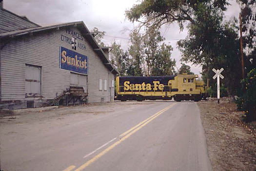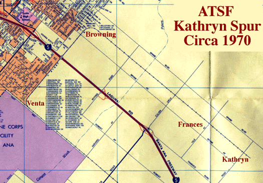 Santa Fe's Kathryn Spur (also called the Venta Spur) left the mainline at Venta, the location of the new Tustin MetroLink Station. From Venta it went northeast to a location called Browning on some older maps (near the current Irvine Blvd), then turned southeast to parallel Irvine Blvd through the current Irvine village of Northwood (formerly called Frances), and ended at Kathryn just after crossing Jeffrey Road. The Irvine Citrus Association, Frances Citrus Association and Irvine Valencia Growers packing houses were located on this spur. At one time a separate line left the spur near Browning and turned northwest, ending in Tustin at the Goldenwest Citrus Association (see the Tustin section, above). Citrus fruit produced by the Irvine Company was sold to all of these packing houses. In April 1975 John Signor captured a Santa Fe CF7 on