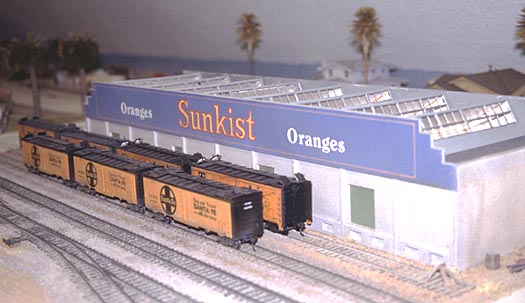 Olive (ATSF) The Olive Heights Citrus Association packing house was on the west side of the Santa Fe's Olive Subdivision tracks, opposite the small Olive, CA station. The cover of the 3rd Quarter 1991 issue of Santa Fe Modeler has a color painting by John Signor of a San Diego-bound, F-unit powered freight passing the packing house at Olive, CA in 1963 (Painting). John photographed the packing house in March 1977. ![]() Inside the packing house he photographed an aerial view of both the packing house and the Olive station (Photo-JS). The aerial photo was hanging on the packing house office wall. Note the spur curving to the right at the bottom right of the photo. For more about this spur, see below. John Signor photos, used by permision. The packing house was demolished in the 1990s. However, before it dissapeared Darrel Lansing photographed it from trackside (Photo-DL). Note the boarded-up doors, the tall weeds, and the tree growing through the loading dock next to the pre-cooling building (Photo-DL). Darrel Lansing photos, used by permision. John Signor built a condensed, HO scale model of the Olive Heights Citrus Association packing house for his home layout (although he named it the Placentia Mutual Orange Association). These two photos show the southeast (Photo-JL) and northeast (Photo-JL) corners of the model. The Olive station was on the Orange-Olive Road, just north of what is today Lincoln Boulevard. A spur left the main line just south of the station and curved across Orange-Olive Road to serve two additional packing houses: the Olive Hillside Growers and the Olive Fruit Company. The
