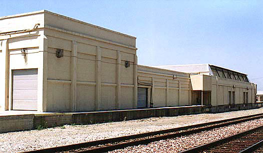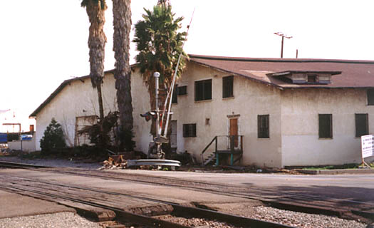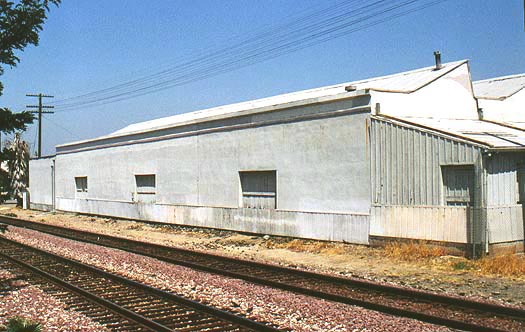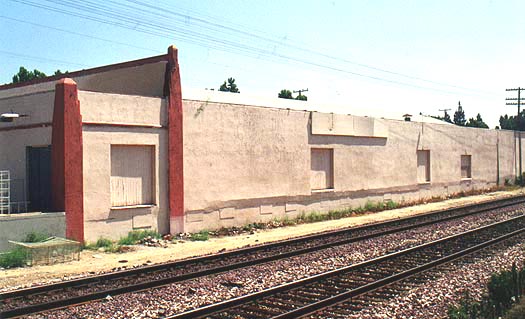 The next photo is a closer view of the original building. ![]() James Lancaster Photo Finally we see the west end of the packing house in a view from the south (Photo-JL), followed by a view of the same end of the building looking toward the northwest corner (Photo-JL). The former Bradford Brothers packing house is just west of the Placentia Cooperative Orange Association packing house. It has add-ons on the west and east ends that are not shown on the 1922-33 Sanborn map. A virtual walk-around shows the packing house as it exists today (in 2002): (1) the south side with its loading doors, ![]() James Lancaster Photo (2) a close-up of the southeast corner and east end showing the add-ons and the saw-tooth roof (Photo-JL); (3) a July 2000 view of the added, flat-roofed, west-end loading dock (Photo-JL); (4) a February 2002 view of the loading dock after a recent paint job (Photo-JL); and (5) the northeast corner with its interesting wood tower (Photo-JL). Another packing house was just east of South Bradford Avenue but on the south side of the tracks, directly opposite the Santa Fe station. The building was odd in that it was not rectangular, but rather was built in the shape of a parallelogram to fit the space between the Santa Fe tracks on the north, Bradford Avenue on the west, and Crowther Ave on the south. The 1917 and 1922 Sanborn maps show it as the Placentia Mutual Orange Association packing house but on the 1922-33 map it had become the Fortuna Packing Company orange packing house. By the late 1940s it may have been operated under the name Babijuice Corporation. This building was demolished in March 2002. Our virtual tour continues with a walk-around of the former Fortuna packing house showing the building as it existed up until March 2002: (1) the north side with its loading doors (Photo-JL); (2) a close-up of the north side (Photo-JL); (3) a view looking across Bradford Avenue at the northwest corner, showing the trees growing where a siding was once located, ![]() James Lancaster Photo (4) a view of the southwest corner of the building at Bradford and Crowther (Photo-JL); and (5) the east side of the building (Photo-JL). These additional photos, taken on April 7, 2002, show similar views after the building was demolished: (6) from the northwest corner (same view as 3, above) (Photo-JL); (7) from the southwest corner at Bradford and Crowther with the Bradford Brothers packing house now visible on the right behind the tractor (same view as 4, above) (Photo-JL); and (8) an overall view of the location from the corner of Bradford and Crowther (Photo-JL). An old photo from the 1920s looks east from just west of Bradford Avenue. The Fortuna packing house is on the right edge of the photo. On the near left is the Santa Fe station. Behind it is the Bradford Brothers packing house. Beyond Bradford Brothers is a building either under construction or being torn down. (Note: Approval is needed to display this photo. When the approval is received the photo will be viewable.) In this July 2001 view, also looking east from the west side of Bradford Avenue, an eastbound inter-modal train is just going out of view (Photo-JL). On the south side of the tracks approximately half way between Bradford and Melrose, the 1917 and 1922 Sanborn maps show the Placentia Orange Grower's Association packing house. On the 1922-33 map the packing house had expanded east to Bradford Avenue by adding an ice manufacturing building, an ice storage building, and a cold storage building. These buildings are still standing as of 2002. Our virtual tour continues with a walk-around of the former Placentia Orange Grower's Association packing house showing the building as it currently exists (May 2002): (1) the north side of the packing house looking west and showing the original building on the right, the cold storage room in the middle, and the ice storage room on the left, ![]() James Lancaster Photo (2) a closer view of the ice storage room with the cold storage room on the right (Photo-JL); (3) a closer view of the original building with the door to the cold storage room on the left (Photo-JL); (4) a close-up view of the door to the cold storage room (Photo-JL); (5) the north side of the packing house looking from the northwest (Photo-JL); (6) the truck loading docks on the southwest side (these are at street level becuse Crowther drops in elevation west of Bradford - the second story is at track level) (Photo-JL); and (7) the south side of the newest addition near the corner of Bradford and Crowther (note the rooftop water tank) (Photo-JL). Just west of the Placentia Orange Grower's Association packing house on the east side of South Melrose, both the 1917 and 1922 maps show the Placentia Canning Company. The canning company no longer appears on the 1922-33 map. This location is a vacant lot as of 2002. On the south side of the tracks but on the west of South Melrose, in an area that is not shown on the 1917 Sanborn map, the 1922 map shows a second Placentia Mutual Orange Association packing house. The 1922-33 map shows an expansion of this packing house, probably to compensate for the sale of the earlier packing house at Bradford and Crowther to Fortuna Packing Company. The Placentia Mutual Orange Association buildings are still standing as of 2002. ![]() ![]() Our virtual tour ends with a walk-around of the former Placentia Mutual Orange Association packing house showing the building as it currently exists (May 2002): (1) the east side (front) of the building on Melrose and the north side along the tracks, ![]() James Lancaster Photo (2) a closer view of the north side of the building showing the brick and concrete construction (Photo-JL); (3) the far west end of the north side of the complex showing more recent additions (Photo-JL); and (4) the lower level truck docks on Crowther (Photo-JL).