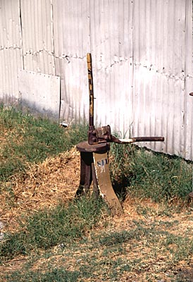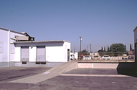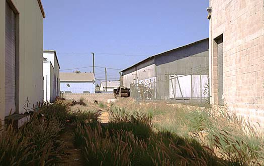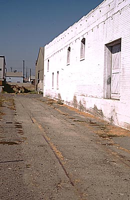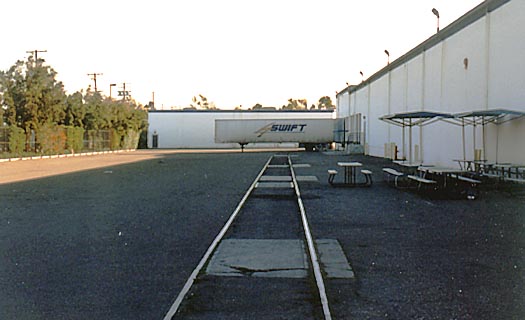 still in place. ![]() James Lancaster Photo. Beyond the switch I found the two tracks hidden by tall weeds. They were simply displaced about two hundred feet north of the location shown on the original map. A revised map shows the corrected track diagram (Map). The two weed covered tracks served four small industrial buildings and two loading docks as shown in this 1997 photo. ![]() James Lancaster Photo. The tracks are listed as "Gooder Outside" and Gooder Inside" in a Santa Fe switch list for Santa Ana from September 1963 (Switchlist). These additional views show the far end of the two Gooder sidings (Photo-JL), the loading dock on the west side (Photo-JL), a close-up of the end of the sidings with their track bumpers (Photo-JL), and a look back toward the Nehi Bottling Company from the loading dock (Photo-JL). A box car spotted at the loading door in the last photo would actually have blocked part of the switch. On a return visit in January 2002 the switch stand was still in place (Photo-JL) next to Tardif Sheet Metal shop, shown at the far right in this view from Terminal Street (Photo-JL). The photo also shows one of the small industrial buildings that backed up to the spur. The tracks are still there and a little more visible without so many long weeds (Photo-JL), although there is now a little more graffiti on the backs of the buildings (Photo-JL). Because of its compact size and multiple, small industries and businesses, the Gooder spur would make a fine modeling project. Bill