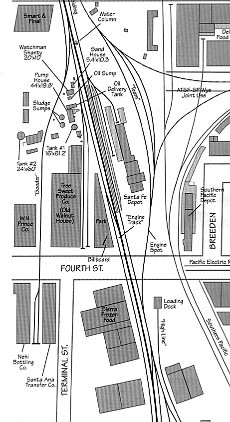 Historic Packing Houses and Other Industrial Structures in Southern California Virtual Tour of Orange County: Santa Ana Copyright 2002, 2020 by James E. Lancaster, Ph.D. Notice:The images - photographs, drawings, maps and track diagrams - presented in this web site are the property of the respective contributors and may not be used for any purpose without permission. For more information see Photo Credits and Restrictions. The web site contains a large number of images. Some are displayed inline with the text. However, to control the loading time, the remaining images are viewed by clicking on the related link, e.g., (Photo-JL), (Drawing-HH), etc. Please note that the images that open via these links appear in a separate web browser window. Santa Ana (ATSF) The Fourth Quarter 1996 issue of the Warbonnet, the official magazine of the Santa Fe Railway Historical & Modeling Society,