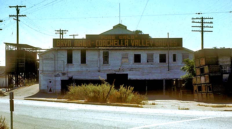 Another part of the valuation map shows two more packing houses on the northeast side of the tracks and south of Barton Road. They are both identified as W. F. Whittier Packing House (Figure 2). The 1928 Sanborn Map shows the same two packing houses but identifies them as Norwood & McCormick (left) and Bryn Mawr Fruit Growers Ass'n (right). ![]() Lee Gustafson Collection. An aerial view of the location of the two W. F. Whittier packing houses from the early 1950s identifies the entire complex as Bryn Mawr - Coachella Valley Groves. Figure 3 shows the northwest end of the complex facing Barton Road in 1971. Note the cull bin on the left. The SP tracks are out of sight to the right.