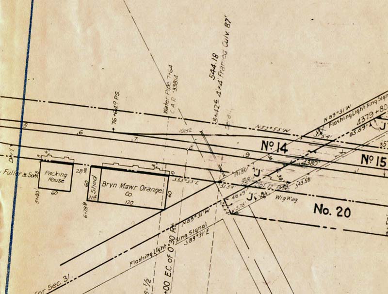 Historic Packing Houses and Other Industrial Structures in Southern California Virtual Tour of Bryn Mawr, CA Copyright 2007 by James E. Lancaster Photos and Maps provided by Lee Gustafson, John Signor and Joe Warren Notice:The images - photographs, drawings, maps and track diagrams - presented in this web site are the property of the respective contributors and may not be used for any purpose without permission. For more information see Photo Credits and Restrictions. Bryn Mawr (SP) Bryn Mawr is located on the ex-Southern Pacific mainline between Los Angeles, CA and Yuma, AZ, a few miles east of Colton, CA. The main highway crossing of the SP tracks in Bryn Mawr is Barton Road. An SP valuation map from the 1900s shows two packing houses, Fuller and Son and Bryn Mawr Oranges, on the southwest side of the tracks north of Barton Road (Figure 1). The 1928 Sanborn Fire Insurance Map shows the same two packing houses but identifies them as Henry Fuller and Son and Allen Break and Son, respectively.