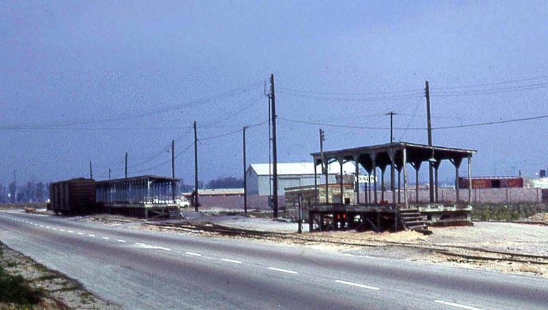 simple loading sheds at Dixon in April 1967. ![]() Etiwanda Ave. is in the foreground. The sheds, evidently used primarily for loading grapes, are shown in more detail in the following close-up view. ![]() Cliff Prather was at Dixon a year later and photographed this UP local from the opposite side of tracks. ![]() Clifford Prather photo, used by permission. In June 1968 Tom photographed an interesting industrial complex in the same general area east of Ontario (Photo-TVW). The exact location and purpose of this facility are unknown. To tour other San Bernardino County cities, or other counties, return to the Virtual Tour of San Bernardino County Page. Return to the Historic Packing Houses and Other Industrial Structures in Southern California Home Page. Last Update: 10/17/11 |