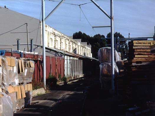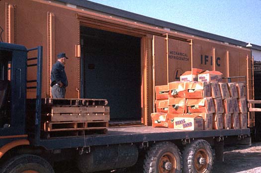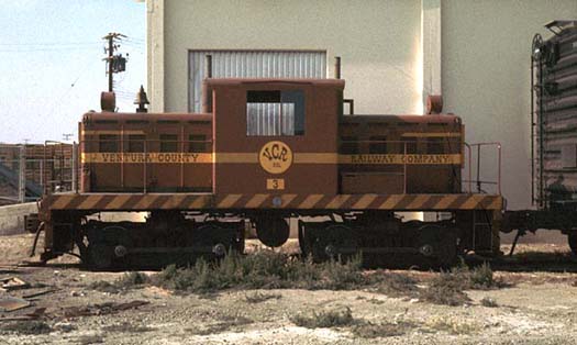 Tom VanWormer was in Oxnard in early Spring 1964 and has provided several views of the produce industry. The first photo shows boxes of cabbage being loaded on a PFE mechanical reefer parked next to a vegetable packing plant. ![]() Tom VanWormer photo, used by permission. Coupled to the reefer is Ventura County Railway (VCR) #3, a Whicomb side-rod driven locomotive built in 1944. At the left is a hopper for loading waste vegetables into trucks for use as fertilizer. The next photo shows a close-up of the boxes of cabbage on the bed of the delivery truck (Photo-TVW), followed by close-up views of the Whitcomb locomotive (Photo-TVW) and the waste vegetable loader (Photo-TVW). Finally, we see a string of PFE ice reefers being loaded from a mechanical icing machine at the Union Ice Company plant ![]() plus a close-up view of the machine and two workmen on top of a reefer (Photo-TVW). The following photos were taken by the author in June 2001. The first photos show the Boskovitch Farms produce processing plant on the east side of Oxnard, just south of the UP (ex-SP) coast line. This photo is looking east from the north entrance (Photo-JL). The track in the foreground leads to a second loading dock. The second photo looks west from the north entrance toward the second loading dock (Photo-JL). There were no rail cars visible at the plant. Just south of the Ventura County Railway shops is a small industrial area bounded on the west by Factory Lane, on the north by Warehouse Avenue, and on the east by Industrial Avenue. How's that for a well named industrial location? On the Industrial Avenue side was a (former?) packing house. This photo shows the loading dock from the north (Warehouse Avenue) side (Photo-JL). This photo shows the loading dock from the opposite end (Photo-JL). On the Factory Lane side was a plastic factory the had been receiving pellets by rail (Photo-JL). By June 2000 the pellets were shipped in by truck. Nearby was this Union Ice Company trailer (Photo-JL). It appeared to be out of service. This photo shows the former SP Oxnard station (Photo-JL). Adjacent to the station was a former Pacific Motor Transport (PMT) freight house (Photo-JL).
