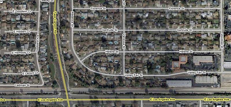 ![]() THE WYE TRACK The following article is from the Rancho Simi Trail Blazers Newsletter, June 2003 (Volume 9, Issue 6) Did you ever wonder why there seems to be so much extra right-of-way just north of the railroad east of Tapo Canyon Road? In Simi Valley: A Journey Through Time, Ken Garges points out how the trains that entered Simi Valley before the Chatsworth Tunnel was completed in 1904 got turned around for the return trip to Oxnard. A "wye" track was constructed just north of the present day intersection of Los Angeles Avenue and Tapo Canyon Road. The "wye" track was just that - an inverted "Y" arrangement that was needed between 1900 and 1904. The Southern Pacific Railroad arrived in Simi Valley in 1900. The only train service was from the west. A train that had just come up from Oxnard would stop at the Santa Susana Station, and then back up into the sweeping northbound curving track, using a switch of course, until it was north of another switch. After that switch was thrown, the train would then pull forward through the switch into a sweeping curve to the west through another switch with the main line. Now the train was turned around for the return trip to Oxnard. Once the tunnel under Santa Susana Pass was completed in 1904 the wye track was no longer needed. The track was extended to the north to the Tapo Citrus Packing Plant, which was located slightly east and south of the City building that is located east of the Department of Motor Vehicles building and south of the County Court House on the Civic Center. That “drill track” crossed Tapo Canyon Road and made a sweeping curve to the west where it terminated at the Tapo Citrus Packing Plant. Once the packing plant had closed down, the track was abandoned and eventual removed. The “Wright Tract” (located north of the railroad between Winifred and Tapo Canyon Road) was built before the track was abandoned, so the southwestern corner of the subdivision reflects the curve of the tracks. The subdivision on the west side was built years after the track was abandoned, so the western side of the right of way was incorporated into that subdivision. [Note: See the Google satellite view, below. The curve in Valley Fair St. resulted from the location of the east leg of the wye.] The City or County acquired the railroad right-of-way north of the main line since it would eventually be needed for the southern extension of Tapo Canyon Road. In those days the General Plan called for the eventual extension of Tapo Canyon Road south to the 101 and north to State Route 126. While Tapo Canyon Road has now been built between Cochran Street and Los Angeles Avenue, the plans for an interregional connection had been dropped. The sweeping curve of the eastern portion of the wye track is still reflected in the development pattern of area. Historic inertia leaves patterns on the land. ![]() Page last updated 4/20/07
