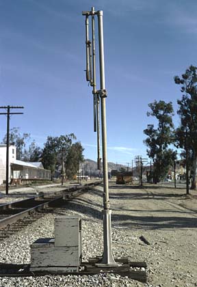 related link, e.g., (Photo-JL), (Drawing-HH), etc. Please note that the images that open via these links appear in a separate web browser window. Santa Susana (SP) Tom VanWormer took several photos in Santa Susana in January 1964. One photo shows a pair of weed covered tracks in front of the Tapo Citrus Association packing house on Alamo Street. (See below for more on the Tapo Citrus Association.) ![]() Another photo shows a mail crane along the main line with a packing house in the background ![]() Wouldn't it be nice to see the Coast Mail's RPO snagging a sack of mail as it roars by? But back to the subject. Here's a somewhat blurred close-up look at the packing house in the rear of the previous scene (Photo). Tom VanWormer photos, used by permission. TAPO CITRUS ASSOCIATION