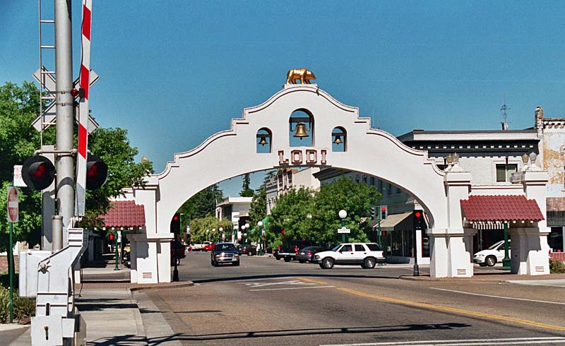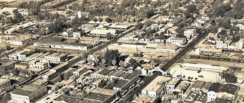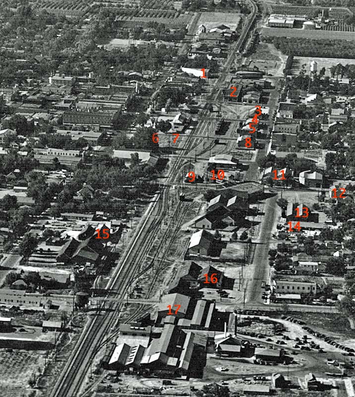 The photo above was taken in 1936. The SP main line runs across the center of the photo from right to left. Stockton would be to the right and Sacramento to the left. The SP passenger depot is in the center of the photo at the uper left of the arch, partially hiden by trees. The SP freight station is at the middle right across from a string of box cars. The Earl Fruit Company is at the left. (Gene Martin collection)