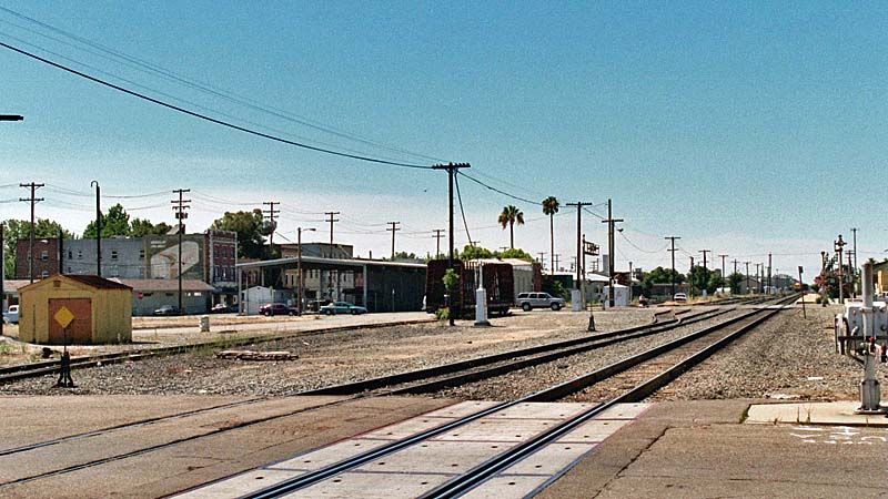 The photo above looks south from East Pine Street along the ex-SP tracks toward Stockton in July 2006. A UP freight train is in the distance. (Jim Lancaster photo)