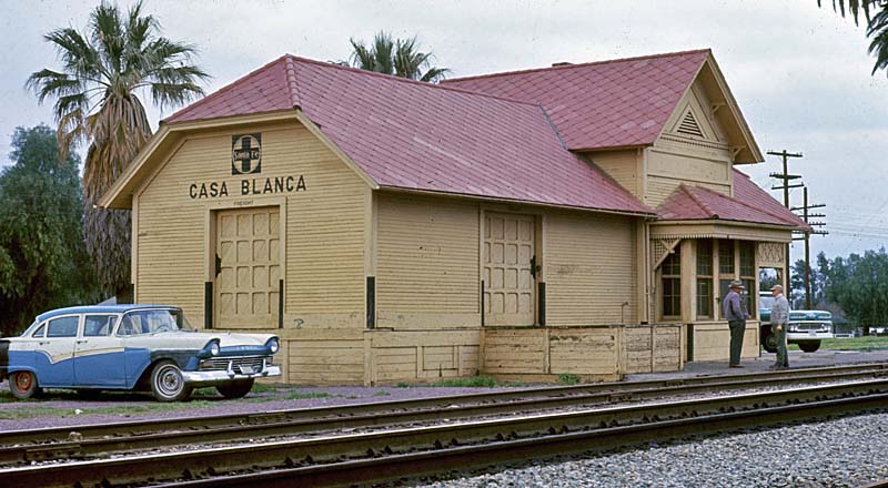 ![]() Casa Blanca depot, February 1965. Marty Quaas wrote, "The photo of the Casa Blanca depot was taken not long before it was torn down. The man on the right was the agent who was about to retire and the man on the left was my uncle Julius Enderud who worked at the Citrus Experiment Station for 40 years. He was big into grafting and budding oranges and used to teach classes to growers and whoever else wanted to learn how to do it." Perris