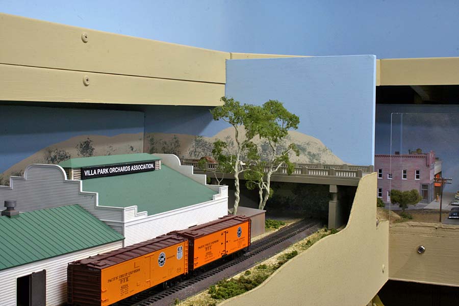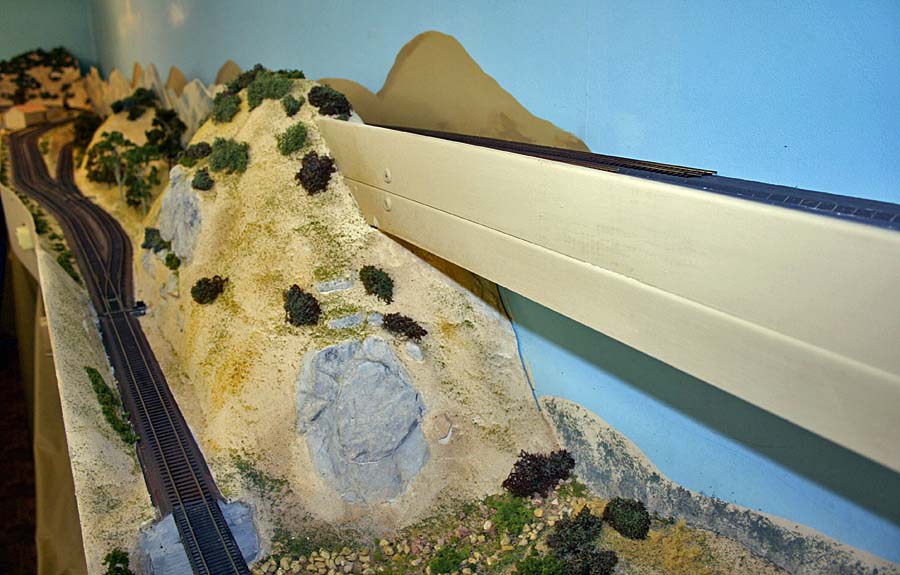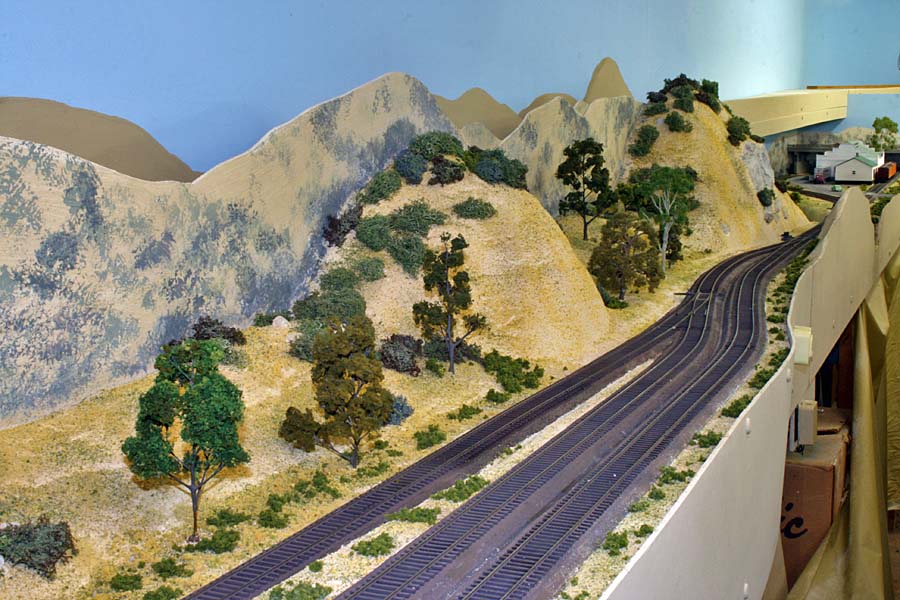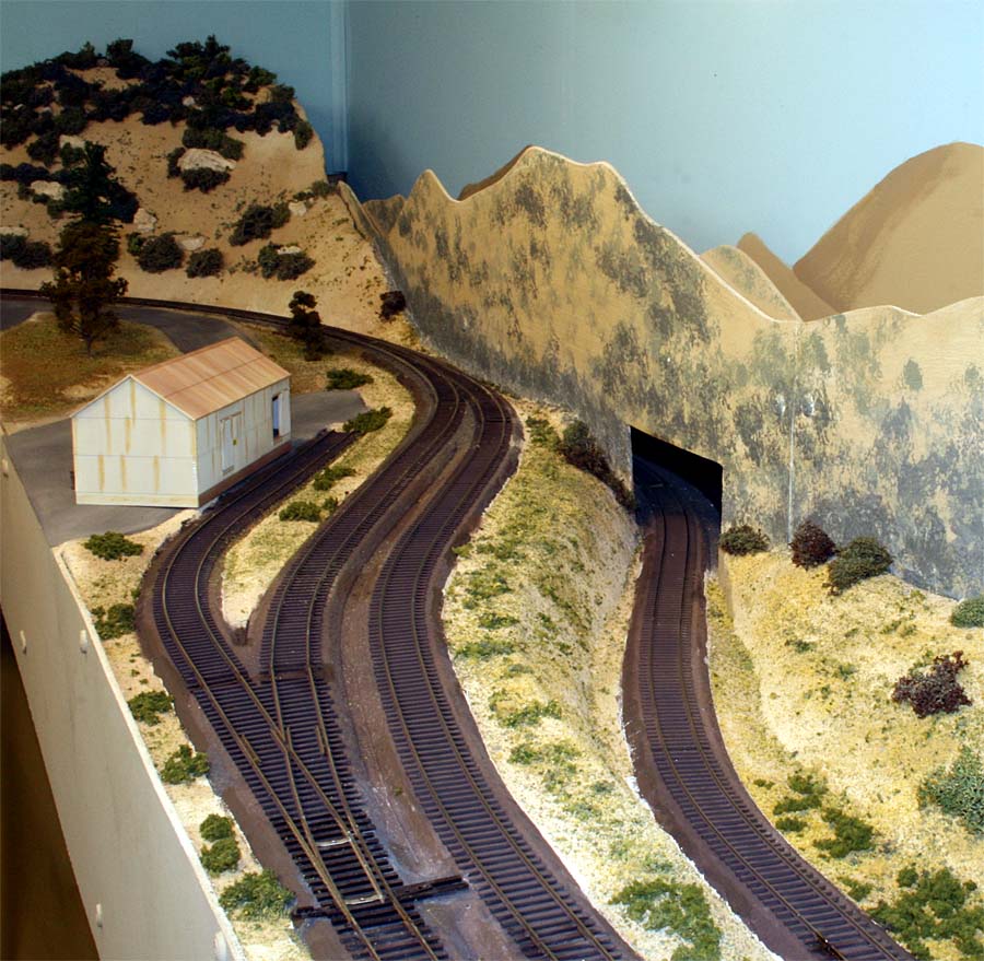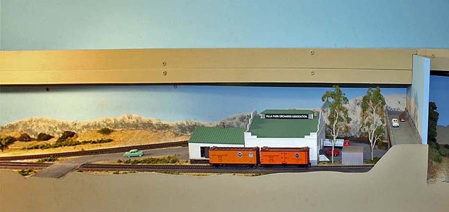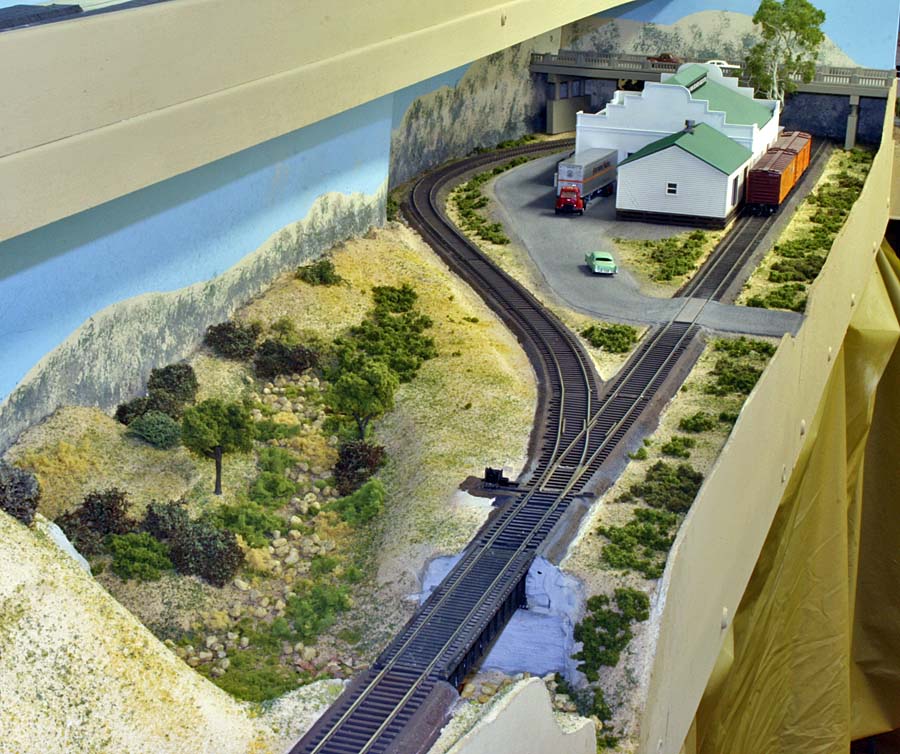For a long time I've planned for an upper deck above Chapman. The upper deck is now in place and is shown in the photo below. It will be the site for Highgrove and will have separate AT&SF/UP and SP tracks. There are currently no tracks or scenery. ![]() Adding the upper deck required a long, 2% grade from Riverside at 52.5" above the floor to Highgrove at 59.5". Part of the grade is hidden behind a low backdrop that has the profile of hills. The other part of the grade is on the second level. A large 3-dimensional hill hides the transition from the backdrop to the upper level. The next photo shows the upper deck above Villa Park. I inserted a view block on the lower deck between Chapman (out of view at the right) and Villa Park (left). The view block helps separate the wide upper deck fascia at the left from the narrower fascia to the right. The main line track goes through the viewblock. The backside of the view block is not normally visible and the highway overpass somewhat hides the opening for the track on the visible side. ![]() The next photo (below) is an overview of the Villa Park Orchards Association packing house at Villa Park. At the lower left is a dry creek bed. ![]() This is a lower-angle view of Villa Park. ![]() The following photo is a close-up view of the Villa Park Orchards Association packing house, the highway overpass and the view block. That's Chapman behind the view block. ![]() The next two photos show the dry creek bed. Although the bridge has been in place for many years the rest of this area has just been plywood and a sheet of foam. ![]() ![]() The next photo shows the cut and the hill that provides the transition to the upper deck. ![]() This next view looks at the cut from the opposite direction. The low backdrop with the hilly profile is on the left. A double track main line between Riverside and Highgrove is behind the backdrop. The upper deck is visible in the distance. ![]() The next view shows the small fruit packing shed at Prado. The track curving to the left goes to Corona. The lower track disappearing into the cutout in the backdrop goes to San Diego. I haven't yet decided how I might disguise the cutout. ![]() The next photo shows the chaparral-covered hill between Prado and Corona. This view is from the Prado side. ![]() The photo below shows the same hill as in the previous photo but from the Corona side of the curve. The poplar trees in the foreground provide a break between the Chapman to Corona track at the base of the hill and the Corona to Riverside tracks that are on the near side of tthe trees (but not visible). Riverside is on the opposite side of the view block on the left (see the May progress report). ![]() The last two photos look across the west end of the LA&SD's Corona yard to the hills of Santa Ana Canyon in the distance. ![]() In the final photo a Santa Fe local freight heads down the canyon. A zebra-stripe RS-1 on the head end and a wood caboose on the rear book-end a 100% AT&SF consist. ![]() Adding the scenery around Villa Park and along Santa Ana Canyon (the west side of the layout) has made a big difference in the appearance of the layout. There is still a lot of work to but the layout is looking much better. It will be open on tours for the Santa Fe Riverside Convention (Sunday July 13, 2008), the NMRA Anaheim Convention (Tuesday and Thursday, July 15 and 17) and the NMRA LDSIG (Wednesday, July 16). More to come .... Last update: 6/26/08 |
