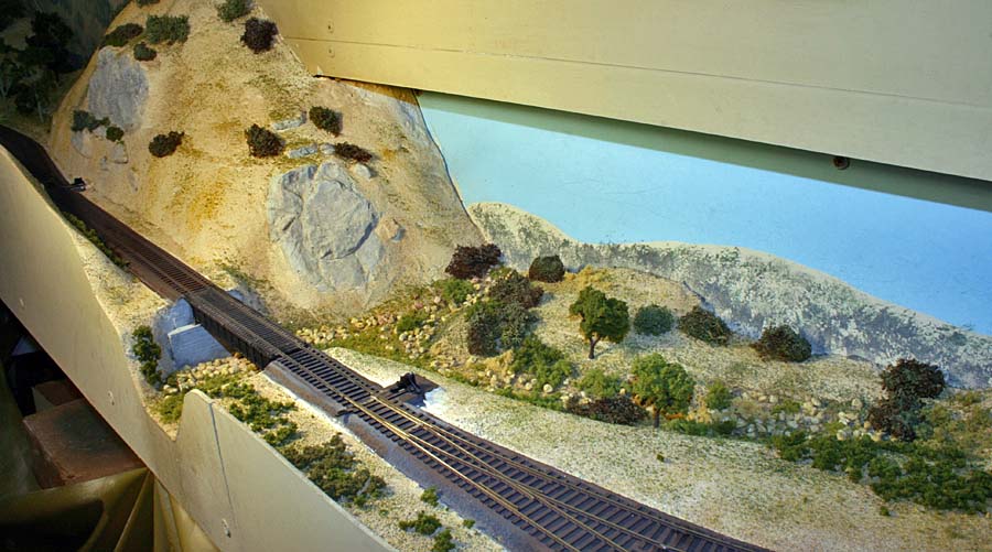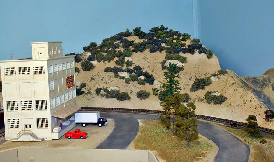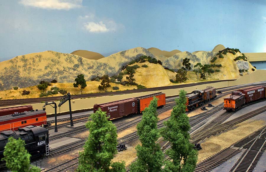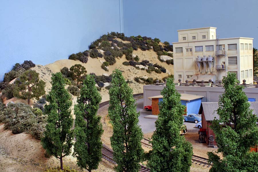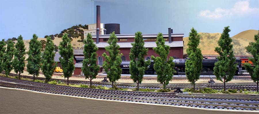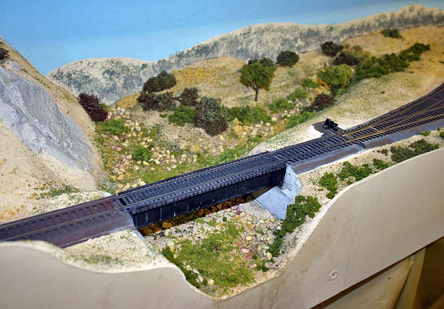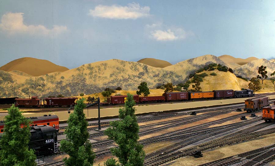 For a long time I've planned for an upper deck above Chapman. The upper deck is now in place and is shown in the photo below. It will be the site for Highgrove and will have separate AT&SF/UP and SP tracks. There are currently no tracks or scenery. ![]() Adding the upper deck required a long, 2% grade from Riverside at 52.5" above the floor to Highgrove at 59.5". Part of the grade is hidden behind a low backdrop that has the profile of hills. The other part of the grade is on the second level. A large 3-dimensional hill hides the transition from the backdrop to the upper level. The next photo shows the upper deck above Villa Park. I inserted a view block on the lower deck between Chapman (out of view at the right) and Villa Park (left). The view block helps separate the wide upper deck fascia at the left from the narrower fascia to the right. The main line track goes through the viewblock. The backside of the view block is not normally visible and the highway overpass somewhat hides the opening for the track on the visible side. ![]() The next photo (below) is an overview of the Villa Park Orchards Association packing house at Villa Park. At the lower left is a dry creek bed. ![]() This is a lower-angle view of Villa Park. ![]() The following photo is a close-up view of the Villa Park Orchards Association packing house, the highway overpass and the view block. That's Chapman behind the view block. ![]() The next two photos show the dry creek bed. Although the bridge has been in place for many years the rest of this area has just been plywood and a sheet of foam. ![]() ![]() The next photo shows the cut and the hill that provides the transition to the upper deck. ![]() This next view looks at the cut from the opposite direction. The low backdrop with the hilly profile is on the left. A double track main line between Riverside and Highgrove is behind the backdrop. The upper deck is visible in the distance. ![]() The next view shows the small fruit packing shed at Prado. The track curving to the left goes to Corona. The lower track disappearing into the cutout in the backdrop goes to San Diego. I haven't yet decided how I might disguise the cutout. ![]() The next photo shows the chaparral-covered hill between Prado and Corona. This view is from the Prado side. ![]() The photo below shows the same hill as in the previous photo but from the Corona side of the curve. The poplar trees in the foreground provide a break between the Chapman to Corona track at the base of the hill and the Corona to Riverside tracks that are on the near side of tthe trees (but not visible). Riverside is on the opposite side of the view block on the left (see the May progress report). ![]() The last two photos look across the west end of the LA&SD's Corona yard to the hills of Santa Ana Canyon in the distance. ![]() In the final photo a Santa Fe local freight heads down the canyon. A zebra-stripe RS-1 on the head end and a wood caboose on the rear book-end a 100% AT&SF consist. ![]() Adding the scenery around Villa Park and along Santa Ana Canyon (the west side of the layout) has made a big difference in the appearance of the layout. There is still a lot of work to but the layout is looking much better. It will be open on tours for the Santa Fe Riverside Convention (Sunday July 13, 2008), the NMRA Anaheim Convention (Tuesday and Thursday, July 15 and 17) and the NMRA LDSIG (Wednesday, July 16). More to come .... Last update: 6/26/08 |