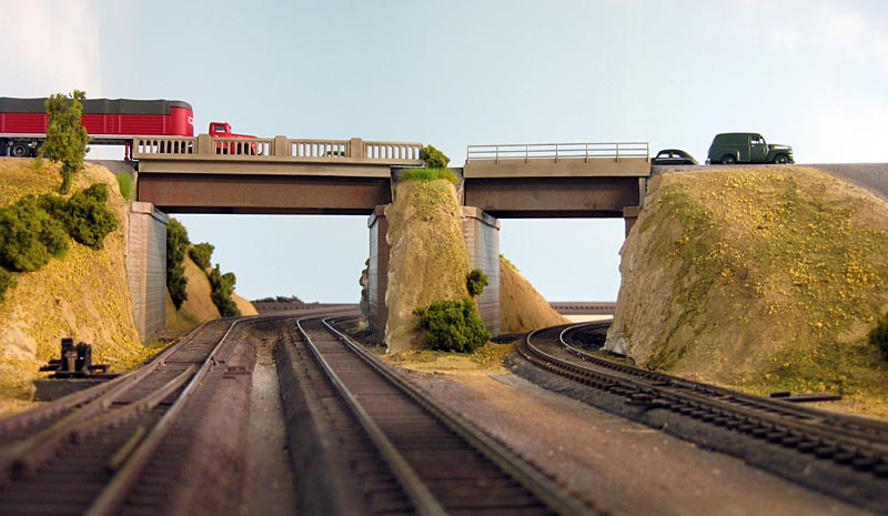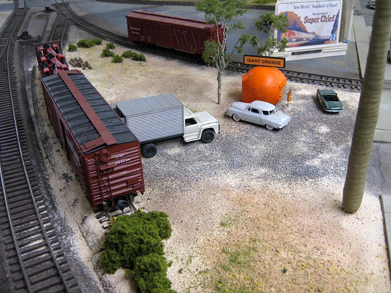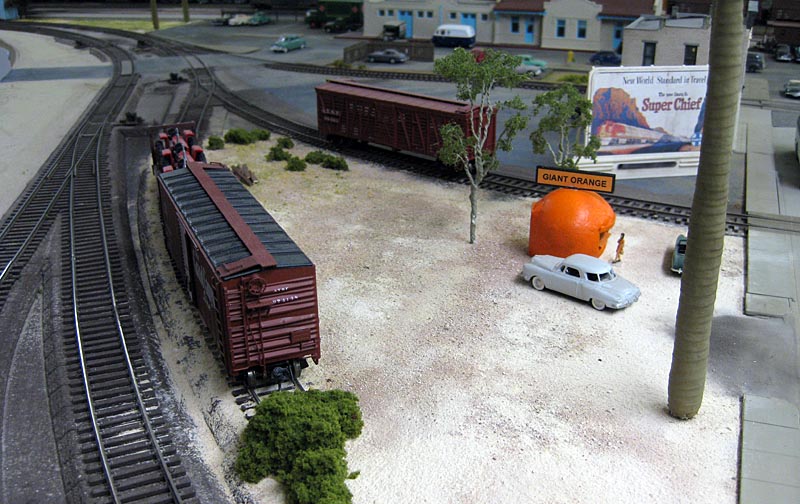My version of Highgrove has the double track Santa Fe-Union Pacific mainline with with one spur and the single track SP Riverside Branch with two spurs. Whereas in reality the two lines are over two blocks apart, on my 20" wide upper deck the two lines are relatively close. ![]() ![]() Figure 4. This