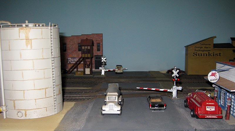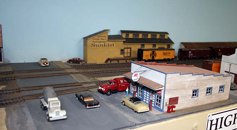 ![]() Figure 9. A Mobil gas station-garage was not in this location next to the SP Riverside Branch where it crosses Center St. But it's an ideal spot to show off the model scratchbuilt by Kevin Barnett.