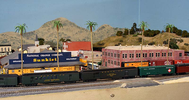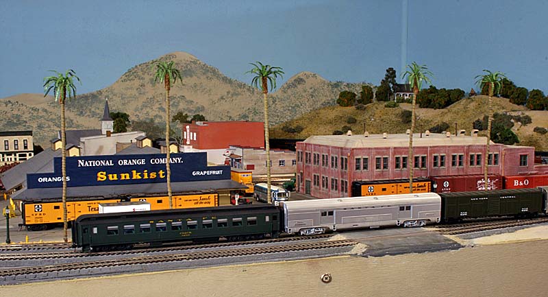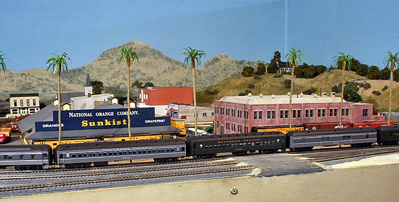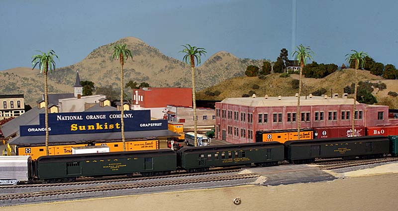 The prototype SP did not operate passenger trains through Riverside. However, on my model railroad the SP-owned Los Angeles and San Diego Railroad has operating rights on the Santa Fe's 3rd district and operates Orange County sections of some of the Sunset and Golden State Route passenger trains. Here we see the westbound Orange County section of the Argonaut crossing 7th Street behind an A-B set of F7s. A PFE express reefer and a Harriman baggage-express car are behind the F-units. ![]() The next photo shows a second baggage-express car and a pair of Harriman chair cars. ![]() A 12-section heavyweight Pullman is on the rear of the train. Now that the two passenger trains have passed the Greyhound bus waiting on 7th Street can cross the tracks and continue its journey to Los Angeles. ![]()