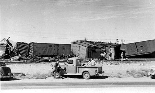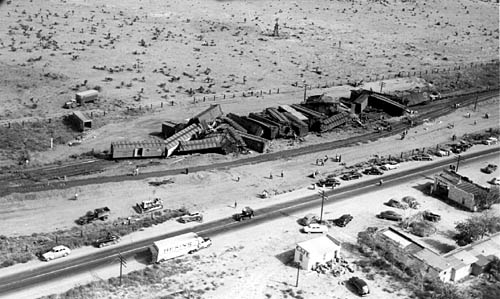 Copyright 2004 by James E. Lancaster My uncle, Ralph Wilson (1912-1958), was a professional photographer and lived in Deming, New Mexico in the late 1940s. These photos of an SP freight train wreck were in his collection when he passed away. The exact date and location are unknown but the vehicles indicate the late '40s and the location appears to be somewhere along the Sunset-Golden State Route. ![]() There are at least 25 wrecked freight cars in this aerial view. Most appear to be PFE wood and steel reefers. There is also at least one Fruit Growers Express wood reefer and an Atlantic Coast Line 50-foot automobile box car. Note that a shoo-fly has already been built around the wreck site. The scene is classic 1940s. Look at the motor court in the lower right corner. Here's a close-up of the Sundown Court Cabins with gas station and an adjacent Cafe. ![]() They look like they'd be perfectly at home in an old Alfred Hitchcock movie. Next is a close-up of the highway with the parked Bekins moving van. ![]() Note the SP sedan in Daylight colors across the highway from the moving van and the black 1930s-era automobile with the load on the roof. Is someone headed for California? Finally, here's a close-up of the two SP tractor-trailer rigs parked nearby. ![]() ![]() This is a closer, ground-level view of the wreck. This is the left end of the wreck in the aerial view. ![]() This is a view of the wreck from across the highway. ![]() Another photographer appears to be getting a close-up photo. ![]() The wood FGEX reefer number 36081 is in the center of this photo. Note the SP pickup truck. ![]() This view shows the ACL auto-box car. This is the right end of the wreck in the aerial view. ![]() The final view shows railroad crews at work cleaning up the mess. If anyone can identify the location of these photos please contact me at LJAMES1@ix.netcom.com.