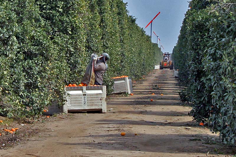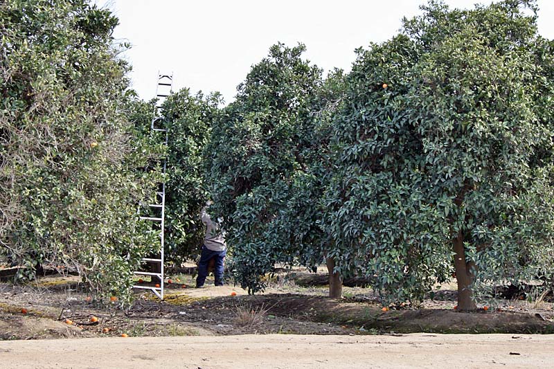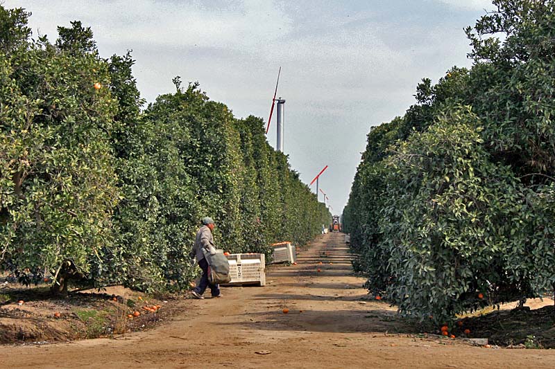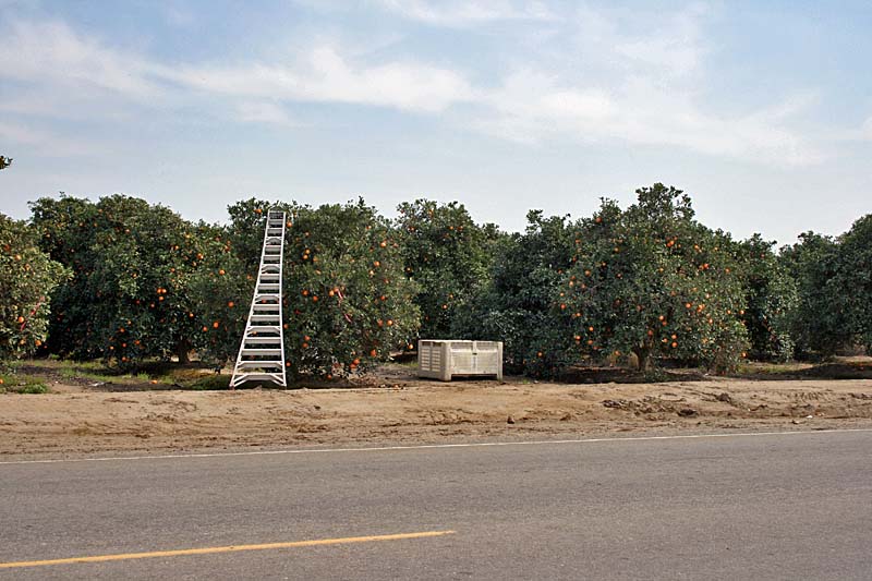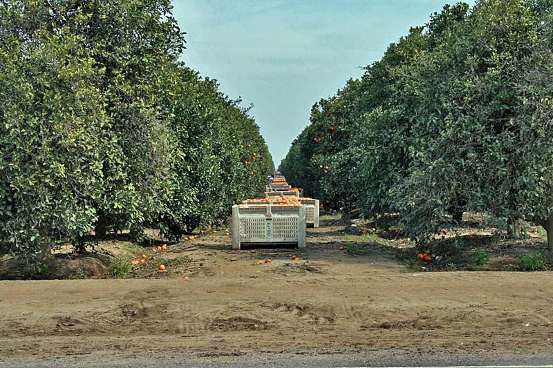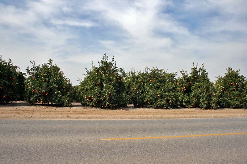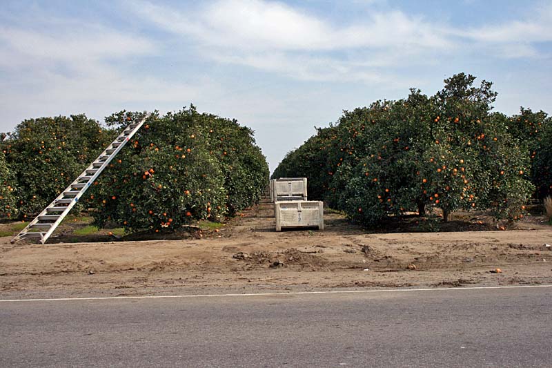 ![]() Photo 1. An orange grove along the Famoso-Porterville Highway, south of Jasmin and a little north of Elmo Highway. The tracks of the SP Exeter Branch once ran where these oranges trees are planted but the rails were removed several years ago. Note how the trees grow very close to the ground. Photos 2-8
