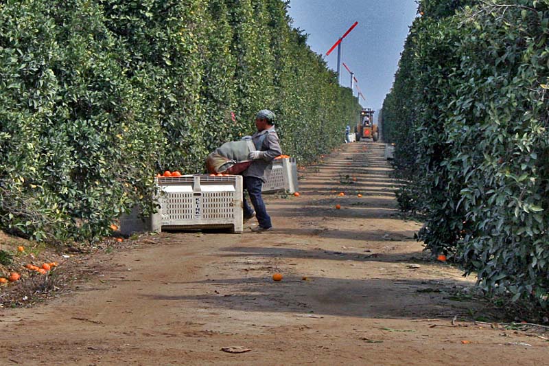 ![]() Photo 3. Fieldboxes are placed along a wider area between rows of trees. ![]() Photo 4. Loaded fieldboxes wait for pickup. Note the furrows for irrigation. ![]() Photo 5. A worker picks oranges. ![]() Photo 6. The worker brings a full sack of oranges to a partially filled fieldbox. Note the wind machines. ![]() Photo 7. The full sack is hoisted over the fieldbox. ![]() Photo 8. The bottom of the sack is opened and the oranges fall into the fieldbox. Note the forklift used to place empty fieldboxes and move loaded fieldboxes onto a flatbed trailer. The trees are pruned flat along the side of this road so the forklift can maneuver through the grove. Last update: 4/5/08 |
