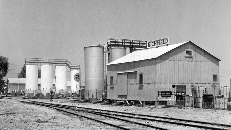 "At Merrill, the tracks turned to the north, crossed Grand, and went under the freeway where there was a run-around track. As I remember, even though the PE and Santa Fe tracks were only a few feet apart at the end of the PE line, there was no connection and it looked like there never was. This was the end of Huntington's dream connection with Yorba Linda. "I then proceeded east along the Santa Fe and took several more pictures - the sand car, the depot, the GP9, the shanties, and then the scale house. I then think that I went south back toward the City Park where I got pictures of two oil companies off the east end of 3rd St." ![]() Pacific