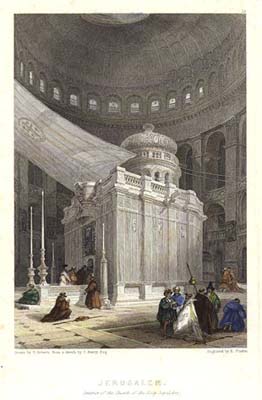 | Interior of the Church of the Holy Sepulchre Drawn by D. Roberts, engraved by E. Finden, published by J. Murray, London, 1834. Steel engraved print with recent hand colour.