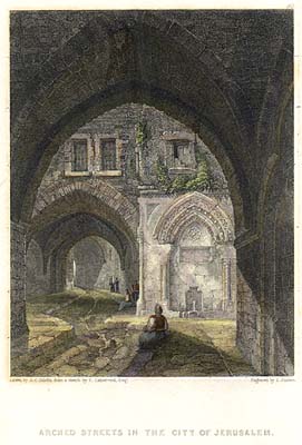 | Arched Streets in the City of Jerusalem Drawn by T. C. Dibdin from a sketch by F. Catherwood, engraved by W. Finden, published in Landscape Illustrations of the Bible, by J. Murray, 1835. Steel engraved print with recent hand colour. This view is looking North along Tariq El Wad (El Wad Road). The street going off to the right is Tariq Bab al-Nazir and leads to a gate onto Temple Mount. The fountain is the Sabil Tariq Bab al-Nazir or Sabil al-Haram. It was built by Suleiman II in 1537.