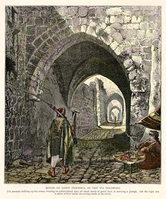 | House of Saint Veronica, in the Via Dolorosa The peasant walking up the street, wearing an embroidered abai, or cloak made of goat's hair, is carrying a plough. On the right sits a seller of fruit under an awning made of his cloak. After a drawing by Harry Fenn, published in Picturesque Palestine, about 1870. Wood engraved print with recent hand colour.