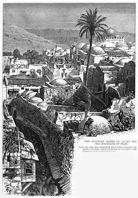 | The Southern Slopes of Olivet and the Mountains of Moab Published in Picturesque Palestine, about 1870. This view is similar to today's view from the roof of the Petra Hotel, which is a short distance inside the Jaffa Gate, on the left side of David Street, the narrow street shown in the lower left of the drawing. The view is across the rooftops of the Old City. The Armenian Quarter is to the immediate right. The Jewish Quarter is in the upper right; the large domed building is the Hurva Synagogue.