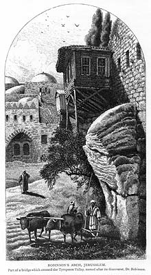 | Robinson's Arch, Jerusalem Published in Picturesque Palestine, about 1880. The area around Robinson's Arch has changed dramatically since this drawing was made. Archaeological excavations since 1970 have lowered the ground level 30-40 feet below the bottom of the arch.