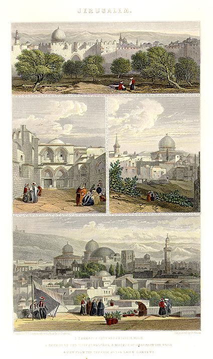 | Jerusalem Engraved by R. Young after a drawing by W. Leitch, published about 1860. (Four Views - 1. Damascus Gate and Walls, 2. Church of Holy Sepulchre, 3. Mosque of Omar, 4. View from Terrace of Latin Convent.) Steel engraved print with recent hand colour.