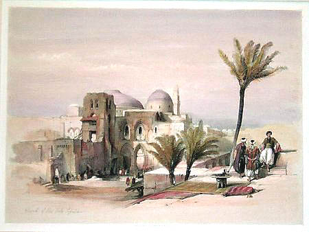 | Exterior of the Church of the Holy Sepulchre A David Roberts original Standard Edition lithograph, published between 1842 and 1849. Originally uncoloured, the print was hand coloured by an unknown colourist. Additional colouring was done by Medina Arts, Seattle, WA so that the colouring more closely matched that of an original, hand-coloured RSE version of the same print in the Library of Congress.