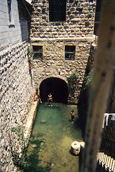 The photo at the left shows the Pool of Siloam in June 1995. The pool is the exit from Hezekiah's Tunnel. The account of the construction of the tunnel under Jerusalem by King Hezekiah, shortly before the city was besieged by Sennacherib in about 701 BC, is described in 2 Kings 20:20 and 2 Chronicles 32:2-4, 30. The tunnel is a third of a mile long, mostly less than three feet wide, and, in a few places, less than five feet in height. It winds under the City of David from the Gihon Spring, an important site in Old Testament Jerusalem, to the Pool of Siloam. |