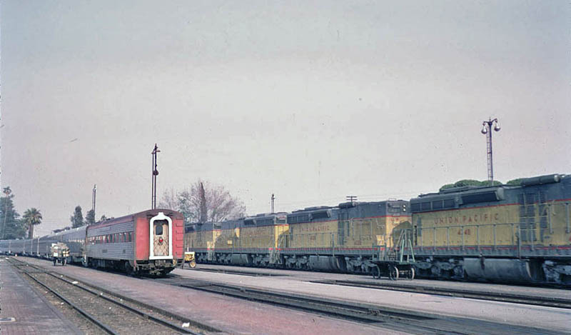 would relay the information to Barstow. Gary Green added a personal anecdote: "My wife-to-be and I rode the Grand Canyon to Barstow (as a date) sometime a year or so before 1963. We were directed to a heavyweight chair car but boarded a lightweight chair car instead. We rode back back to LA on the Chief and rode in the big dome." Late Summer 1965 My last opportunities to photograph the afternoon action in San Bernardino before the big passenger train reduction of late 1967 and early 1968 occurred in late summer of 1965. Figure 11. The Grand Canyon arrived from LA behind five somewhat dirty F-units. Behind the locomotives are ten head end cars: three REA express reefers, two foreign road baggage cars, a New York Central Flexi-Van, a modernized Missouri Pacific baggage car and three Santa Fe baggage cars.
