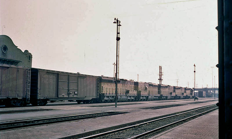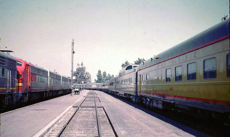 Memories of Train Time in San Bernardino during the Summers of 1964 and 1965 Copyright 2007, 2013 by James E. Lancaster, Ph.D. All photos are by the author and are Copyright 2007. They may not be used for any purpose without the permission of the author. The afternoon was a busy time at San Bernardino in the early 1960s with several eastbound passenger trains. In early 1964 there were still four eastbound trains in a period of about four hours - the Santa Fe Chief, the Union Pacific City of St. Louis, the Santa Fe Grand Canyon and the UP City of Los Angeles/Challenger. By the summer of 1964 the City of St. Louis and the City of Los Angeles/Challenger had been combined on a single schedule but the train was still running with separate sleeping car and coach sections. In addition, if Santa Fe's westbound Fast Mail was on time you'd see yet another train. With added Santa Fe and Union Pacific freight trains there was always plenty of action to keep a railfan occupied. The images on this page were scanned from 35mm slides that were shot using a malfunctioning camera that had a tendency to sometimes overexpose the photo. In addition, the color on many of the slides has shifted and faded, some significantly. The slides have also picked up a lot of dust and scratches over the past 40+ years. I did the best I could using Photoshop Elements to improve the images.June 1964