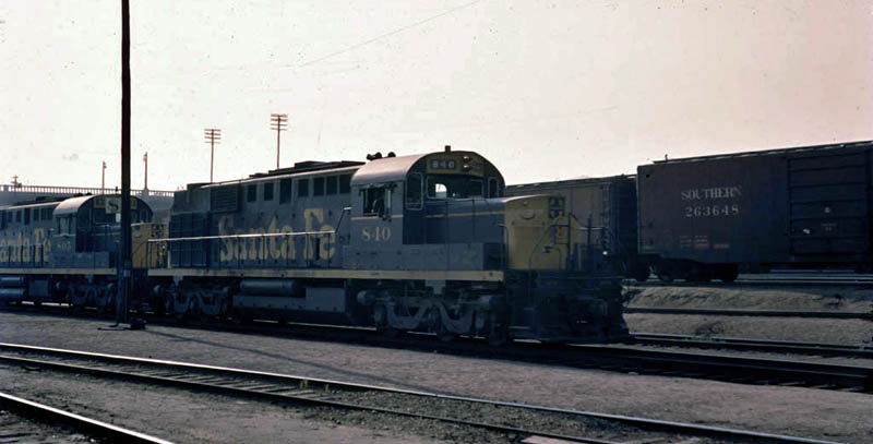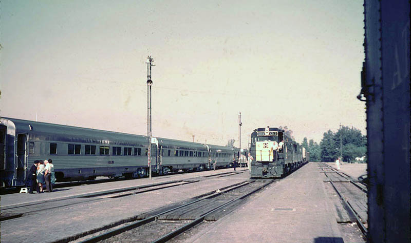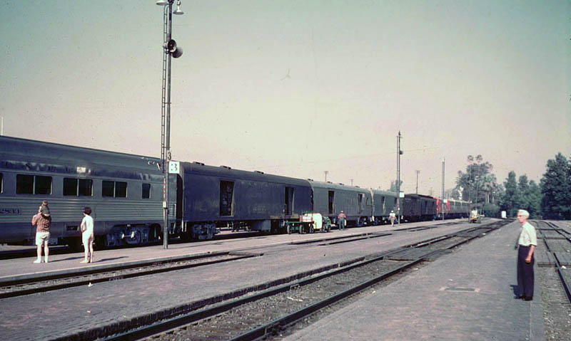 Figure 10. The final photo shows more of the Grand Canyon's consist as well as a westbound Santa Fe freight behind GP30 1213. At the far left behind the three lightweight coaches you can just see the corner of a heavyweight chair car for Santa Fe employees. These were quite common on the Grand Canyon for at least another year after this photo was taken. Behind the heavyweight car were more chair cars and two or three sleeping cars, usually including one or two 6-6-4s and one 8-2-2. Prior to the summer of 1964 one of the sleepers had been a 24 duplex roomette car. The train did not carry a diner or lounge. Eastbound these cars were added at Winslow, AZ. On one occasion I saw a particularly long eastbound Grand Canyon leave San Bernardino with an Alco RSD5 pushing on the rear. The passengers in the sleeper just ahead must have had quite a ride. Cliff Prather provided additional information: "The Grand Canyon was an interesting train with a healthy number of head end cars, unreserved chair cars LA - Chicago, LA - Chicago sleeper, LA - Dallas sleeper, and a reserved LA - Dallas chair car. The Texas cars were switched to or from the San Francisco Chief at various points over the years. "[Regarding