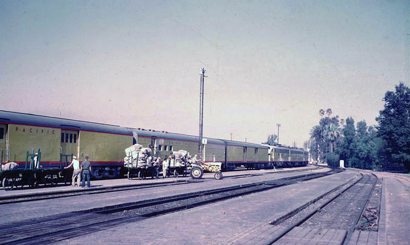 Ed Von Nordeck provided the following additional information: "Train 7 [the westbound Fast Mail] would set out a mail storage car at San Bernardino, and it would be spotted in the location shown, just outside the mail room. San Bernardino would unload it for the Post Office. I suspect this day, it was one of the passenger Express Box Cars that had steam lines for passenger train service. "The freight cars on the track to the right were on one of two stub tracks that years back had been used for the local passenger trains between San Bernardino and LA, as well as the mixed train to San Jacinto." July 1964