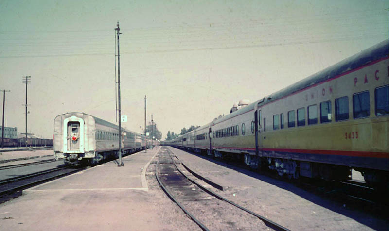 Figure 8. The coach section included two dome-coaches and the newly-modernized buffet-lounge (UP 4051) shown at the right side of the above photo. Five of these buffet-lounge cars (UP 4050-54) had been rebuilt by the UP from 3600-series diners in the spring of 1964 and placed into service on #103 and #104 just before Memorial Day, in time to help provide additional food and beverage service on the expanded summer consists. The UP train was just departing as the Santa Fe Grand Canyon arrived on the left behind five F-units. The Grand Canyon was due in at 3:40 PM.